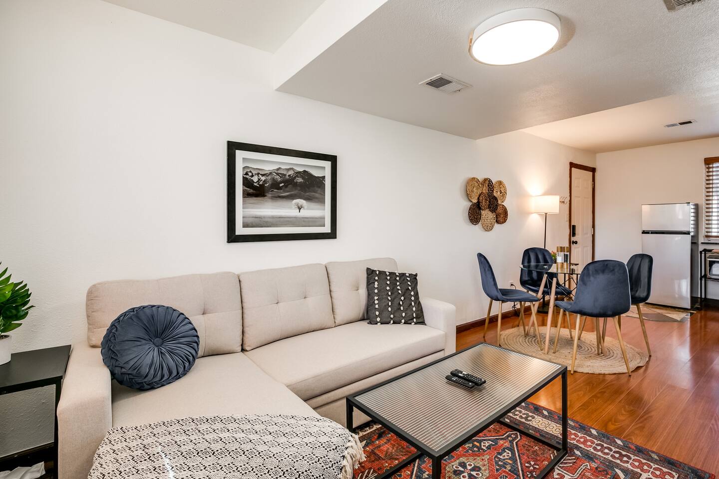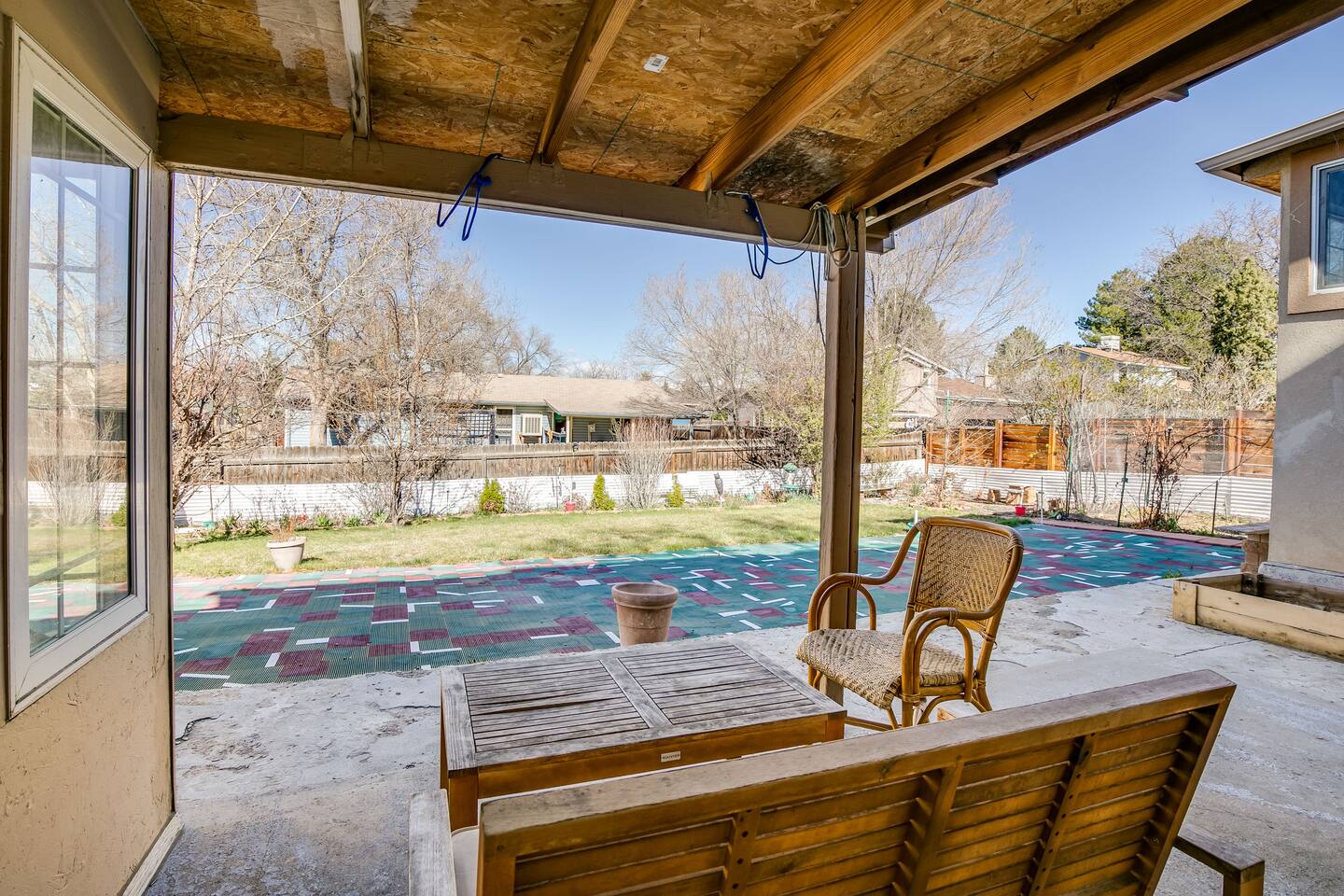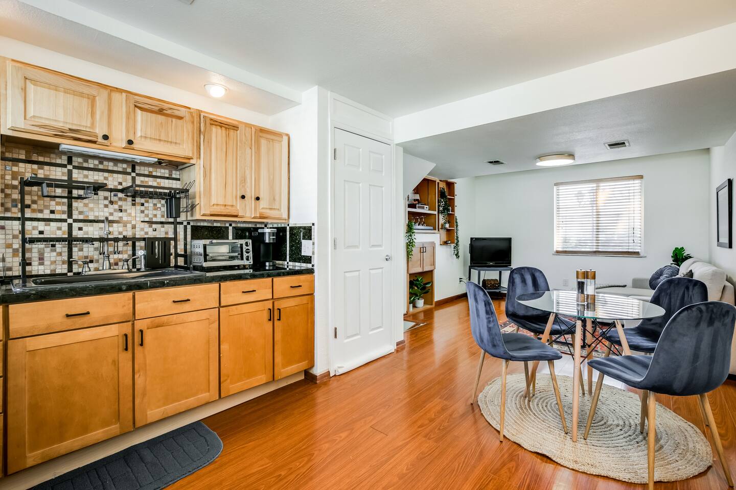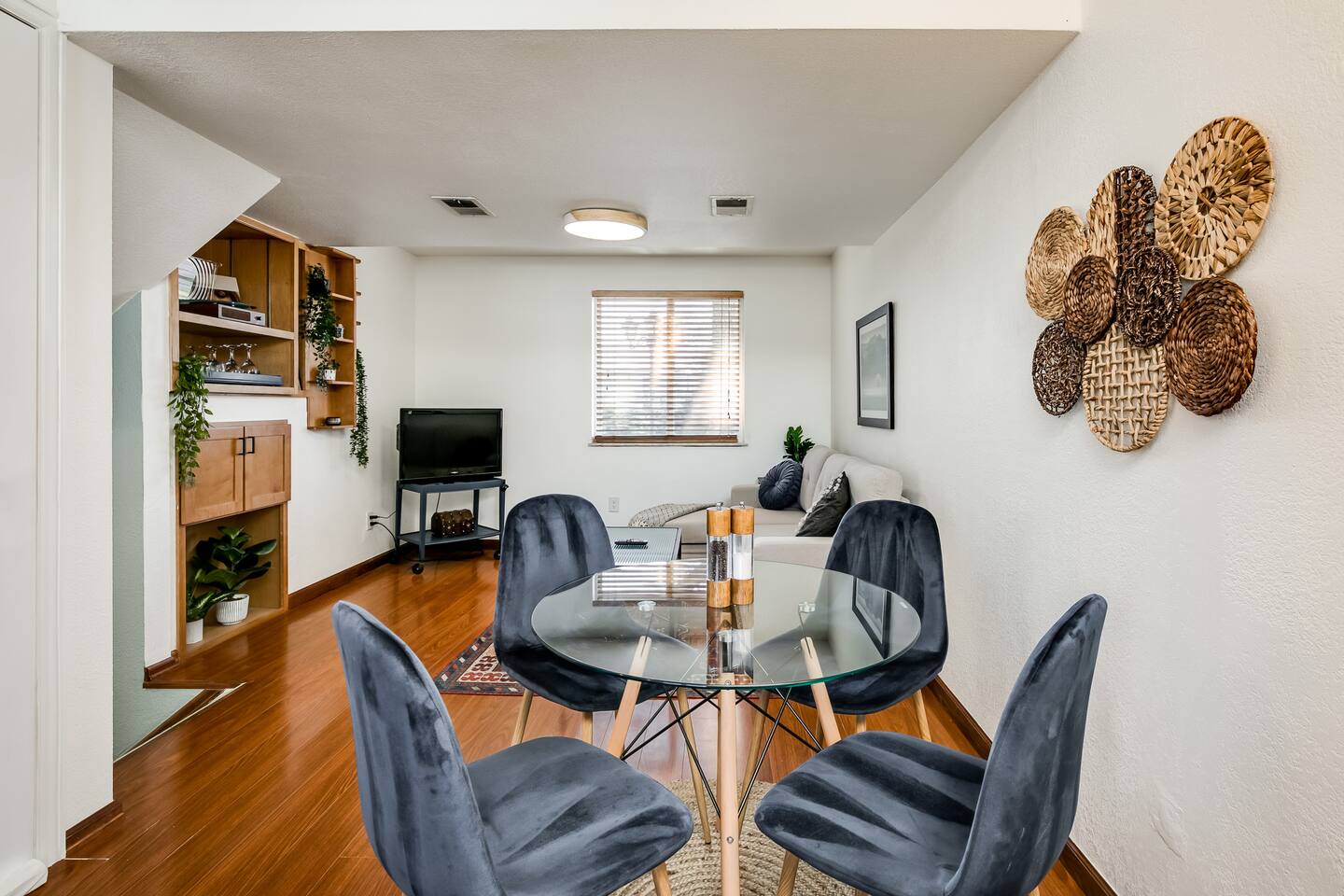 This guest suite is in the basement/garden level of a home with an adjacent unit behind a wall and door. While we’ve done our best to minimize sound transfer as much as possible, you may still hear some footsteps and muffled conversation. BEDROOM The bedroom contains a queen memory foam mattress sitting beneath a mountain mural. The bedroom also contains a desk and chair for convenient working from home on our high-speed Wi-Fi. This space is definitely a relaxing retreat! BATHROOM The bathroom contains a gorgeous custom shower outfitted with free shampoo, body wash, and conditioner. LIVING ROOM The living room is outfitted with a couch that converts into a sofa bed, 32" TV, and record player with vinyl records. There is also a bar with all you could need to enjoy a bottle of wine or other beverage after a long day of exploring Colorado. If you have a third guest, the pull-out sofa bed is available for them and we have worked to make it as comfy as possible! DINING AREA There is a four-person dining table with room for everyone to sit and enjoy a home cooked meal from our stocked kitchenette. KITCHENETTE Contains all the cooking appliances you could need other than a full oven - hot plate burners, a toaster oven, coffee maker w/ free coffee, microwave, electric kettle, apartment-sized refrigerator and all the supplies you could need to cook on an extended stay. BACKYARD / PATIO This space is shared but we give preference to our guests to use it. The covered patio makes for a great place to unwind and watch the sunset over the mountains (when the blooming trees don't block the view) OTHER The home contains one thermostat which you will unfortunately be unable to access. However, we keep the home between 69 and 72 degrees dependent on season. We have provided heaters and fans for you to further tweak the temperature to your liking. You are also welcome to reach out to us and we will be happy to adjust the temperature for you on demand! This guest suite is in the basement of a home with an adjacent unit behind a wall and door. While we’ve done our best to minimize sound transfer as much as possible, you may still hear some footsteps and muffled conversation. There is a small 20lb dog on the property named Woody. He is friendly to new people but may give you a couple welcome barks when you enter. We are more than happy to introduce you to him upon request!