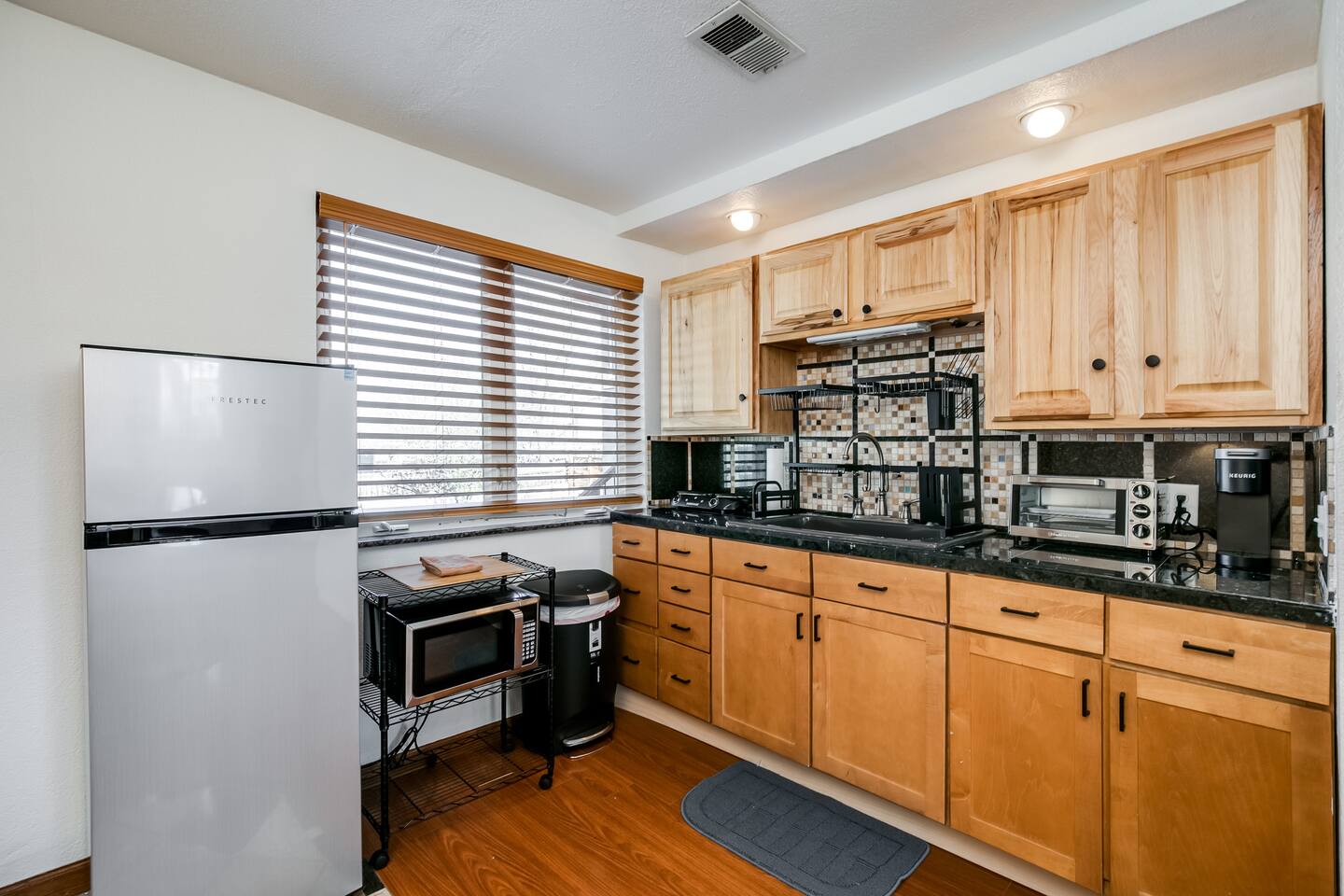 The home contains one thermostat which you will unfortunately be unable to access. However, we keep the home between 69 and 72 degrees dependent on season. We have provided heaters and fans for you to further tweak the temperature to your liking. You are also welcome to reach out to us and we will be happy to adjust the temperature! There is a small 20lb dog named Woody on the property. He’s friendly and loves people but he may give you a few welcome barks on arrival. We’re happy to introduce him on request!
